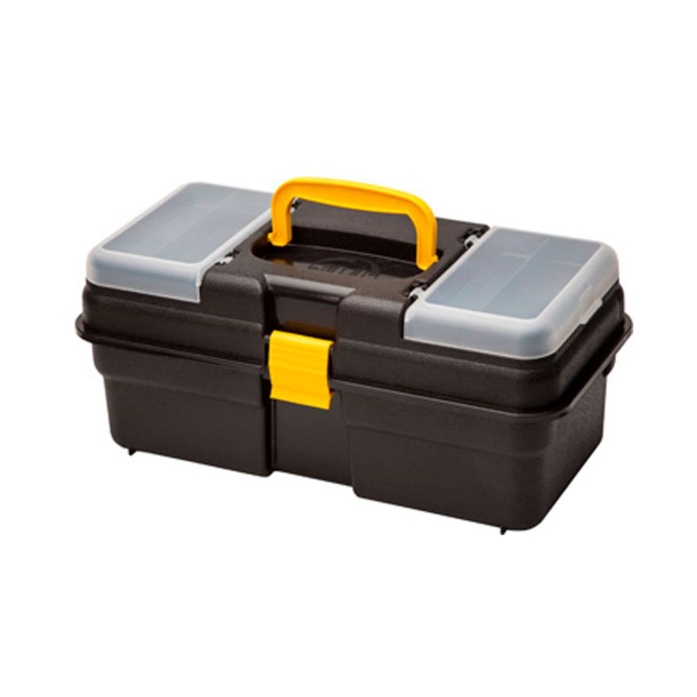 Caixa com 01 bandeja móvel – sem tampa na bandeja. Possui dois compartimentos com tampas na parte superior da caixa