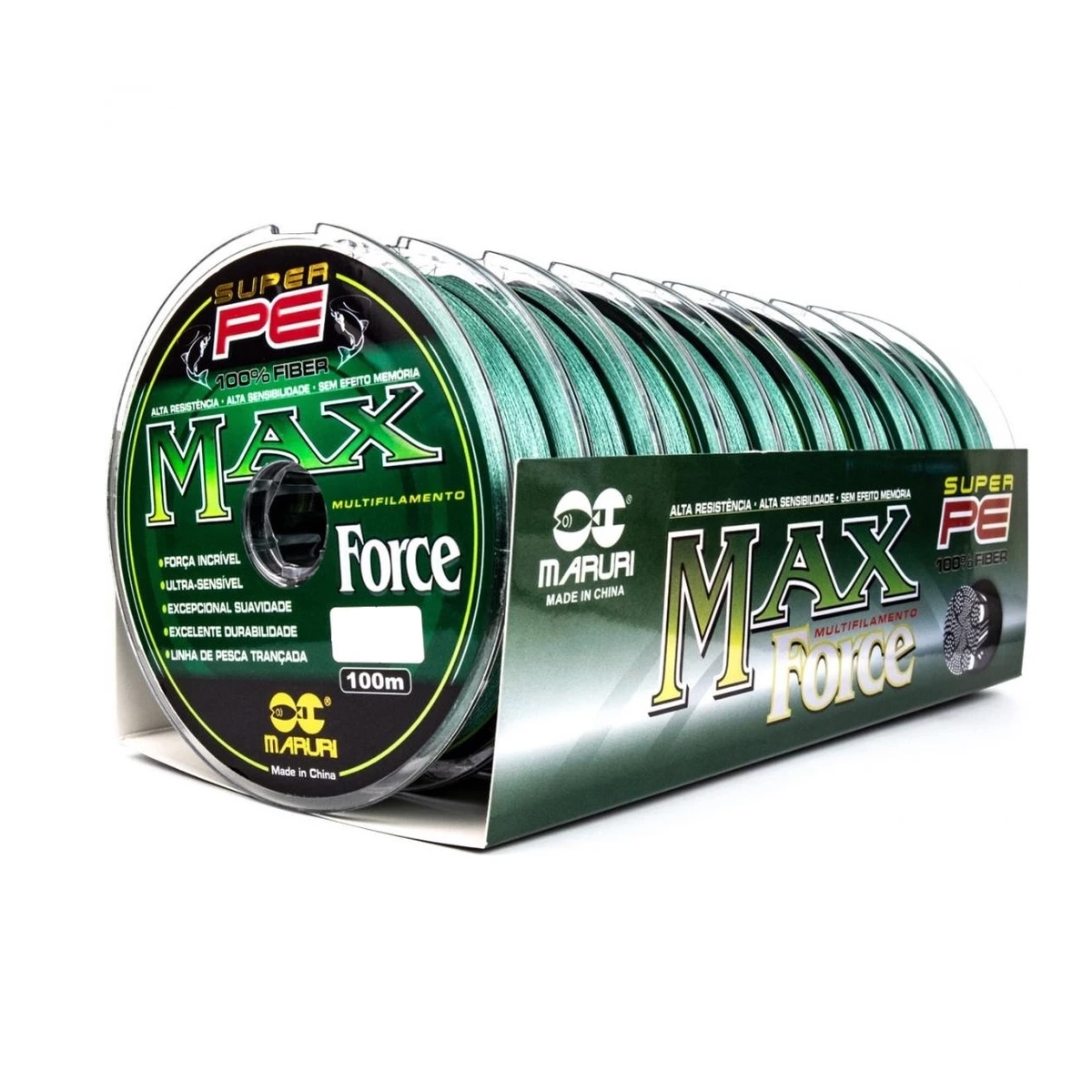 A linha multifilamento Max Force Super PE Braid é construída com fibras trançadas.